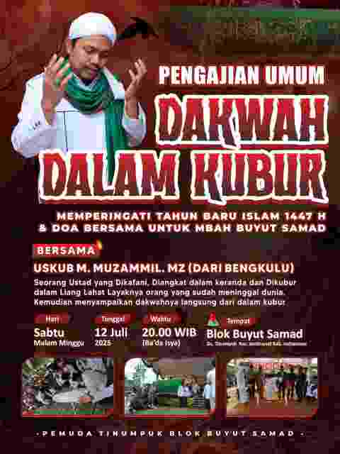 INDRAMAYU,Infojabar.co.id |  Memperingati Tahun Baru Islam pemuda Tinumpuk Blok Buyut Samad bakal menggelar tabligh akbar (pengajian umum) bersama Uskub (Ustad Kubur ) M. Muzamil Bengkulu, Sabtu malam (12/07/2025).