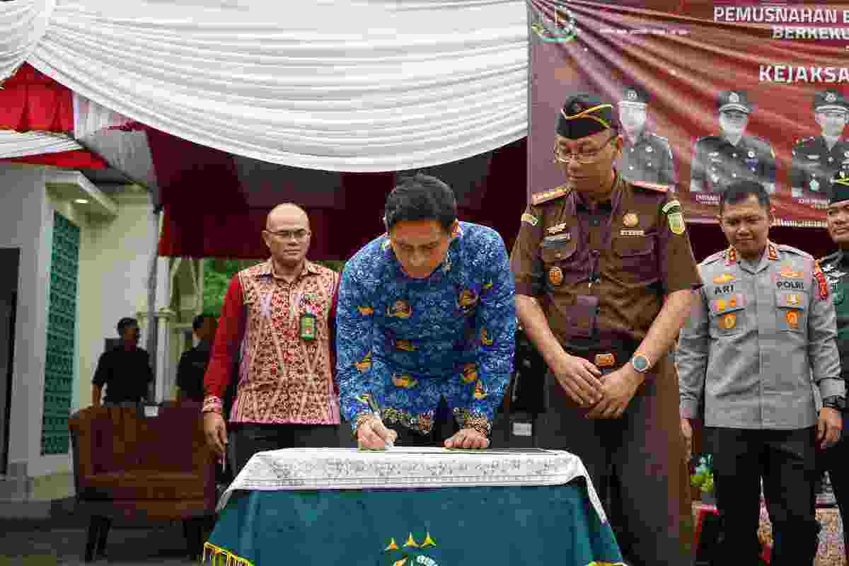 Pemusnahan barang bukti tersebut dilakukan setelah penandatanganan berita acara oleh Kepala Kejaksaan Negeri Indramayu (Kajari) didampingi dan disaksikan oleh Bupati Indramayu Lucky Hakim, Ketua Pengadilan Negeri Indramayu, Kapolres Indramayu, Dandim 0616 Indramayu, Kepala Lapas Indramayu, Karupbasan, Kasatpol PP & Damkar, Kepala Dinas Kesehatan Indramayu, Kepala Dinas Pendidikan dan Kebudayaan Indramayu serta tamu undangan lainnya.